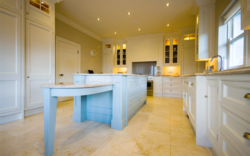 The kitchen is a handmade beaded in-frame construction with flush fitted moulded flat panel doors mounted on stainless steel butt hinges and inlaid secret magnet door catches. Solid White Oak drawer boxes open on secret soft-close runners with brushed nickel scoop and round knob handles.
