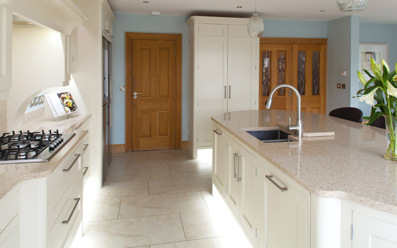 Above the hob is a solid mahogany hand-painted canopy, with scooped corbels to maximise work space around the cooking area.
